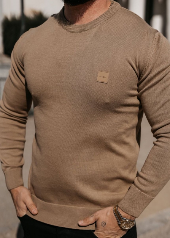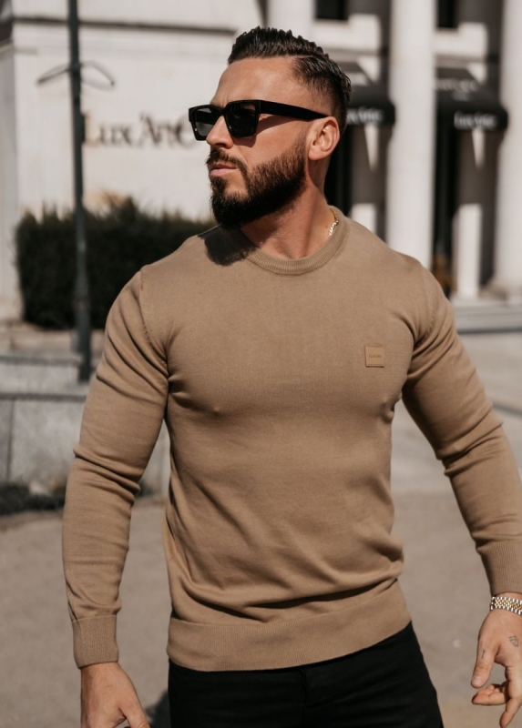 Testhezálló szabású, hosszú ujjú pulóver kerek nyakkivágással. A nyaknál, mandzsettáknál és az alján bordázott passzéval készült. Mellrészén minimalista, tónusos logós felvarró található.