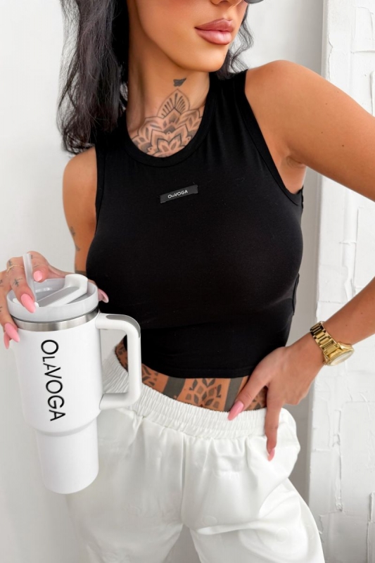 Testhezálló, rövidebb fazonú felső rugalmas kötött anyagból. Kerek nyakkivágással és elöl finom logós felvarróval készült.