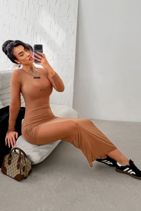 Réteges kialakítású, testhezálló ruha, amely egy rövid, pántos alapruhából és egy hosszú ujjú, térd alá érő áttetsző felső rétegből áll. A külső rész zárt nyakkivágással készült, rugalmas, átlátszó hálós anyagból, amely modern és különleges megjelenést biztosít. A modellen diszkrét, felvarrt logó található.