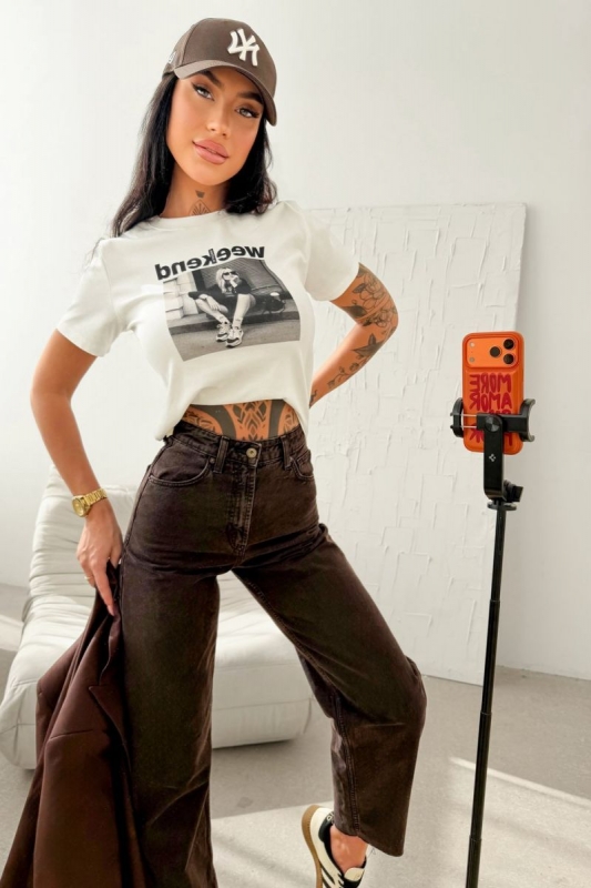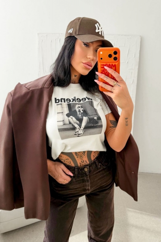 Klasszikus szabású póló kerek nyakkivágással és rövid ujjal. Elöl „Weekend” felirattal és fotó inspirálta grafikával díszített.