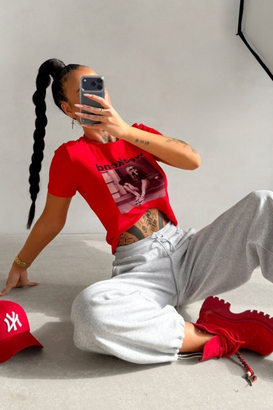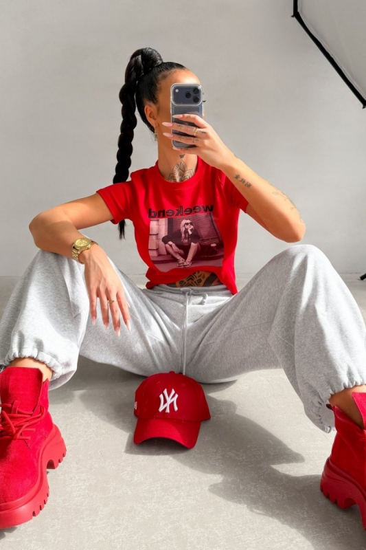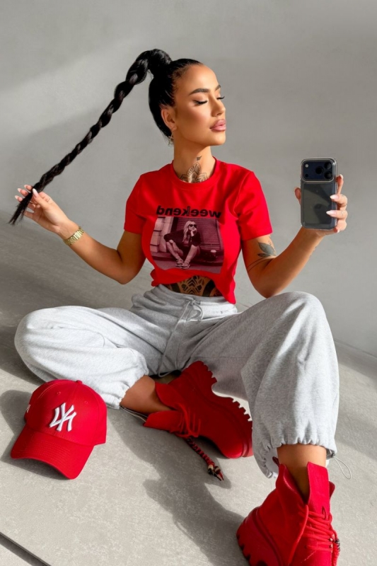 Klasszikus szabású póló kerek nyakkivágással és rövid ujjal. Elöl „Weekend” felirattal és fotó inspirálta grafikával díszített.