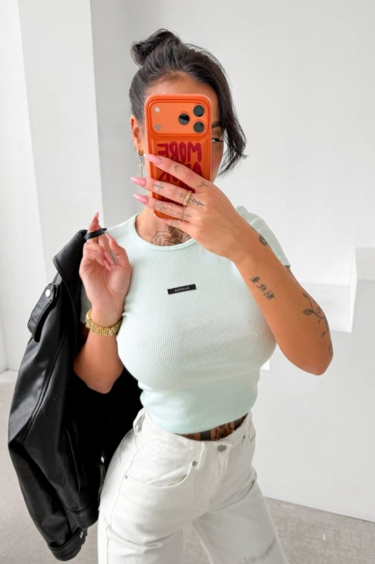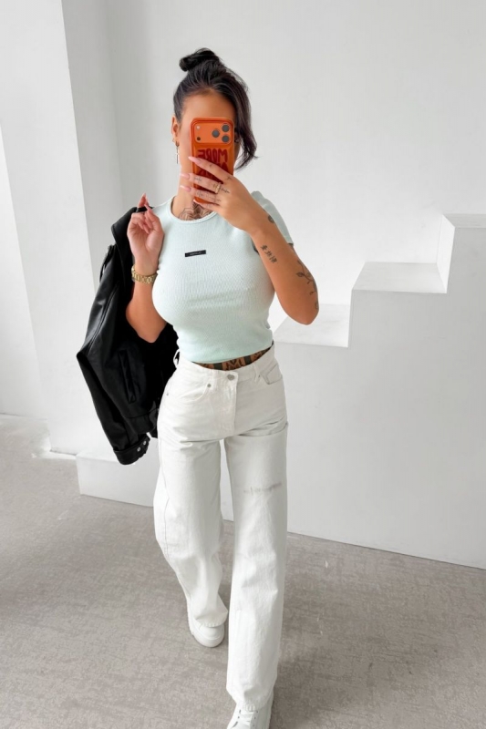 Testhezálló szabású basic póló bordázott kötött anyagból. Kerek nyakkivágással és rövid ujjal készült, kényelmes, jól kombinálható alapdarab.