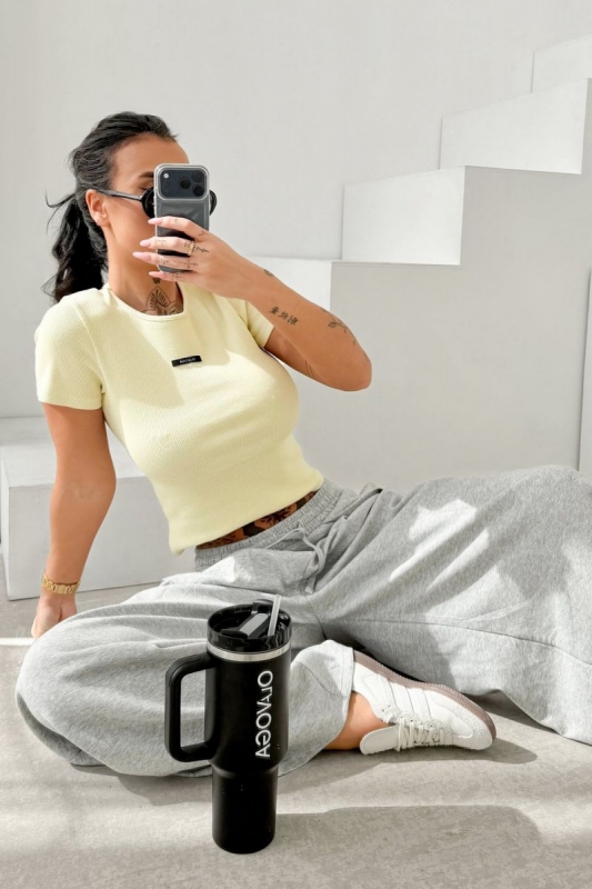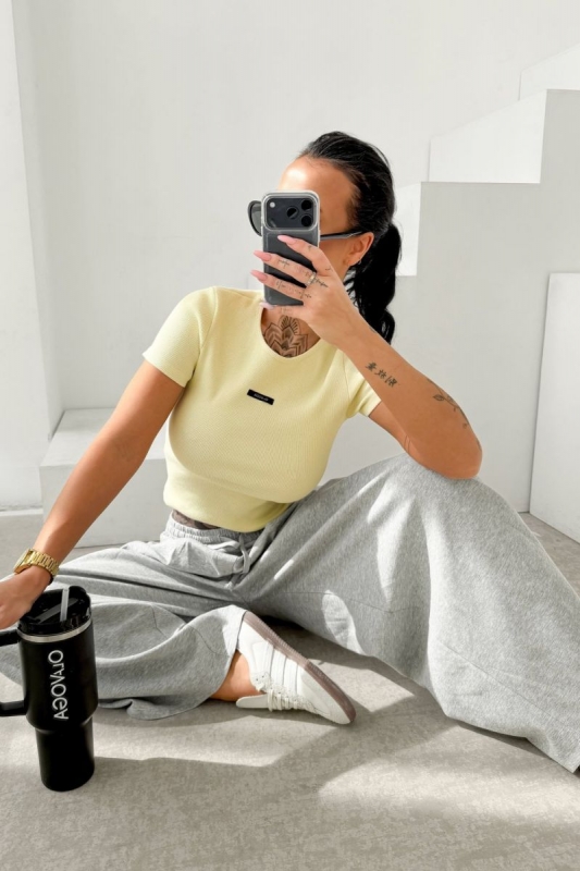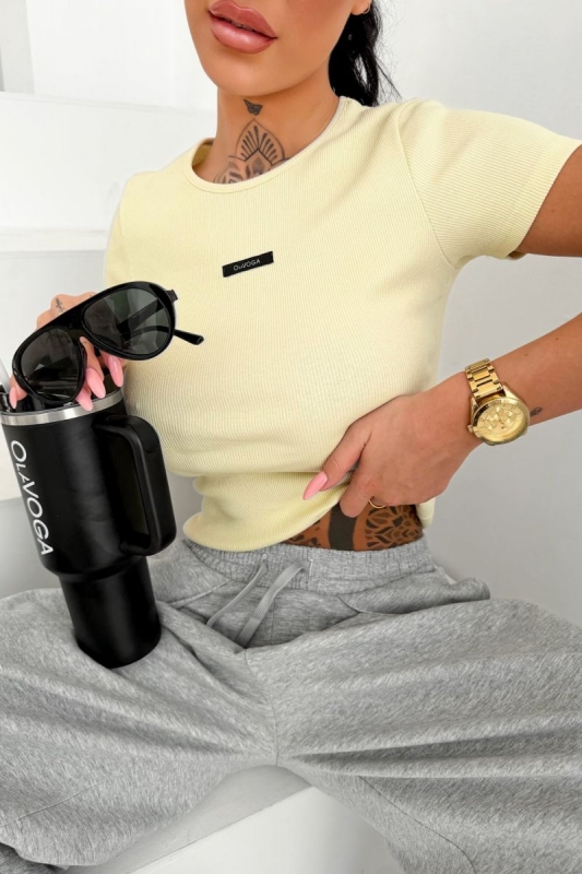 Testhezálló szabású basic póló bordázott kötött anyagból. Kerek nyakkivágással és rövid ujjal készült, kényelmes, jól kombinálható alapdarab.