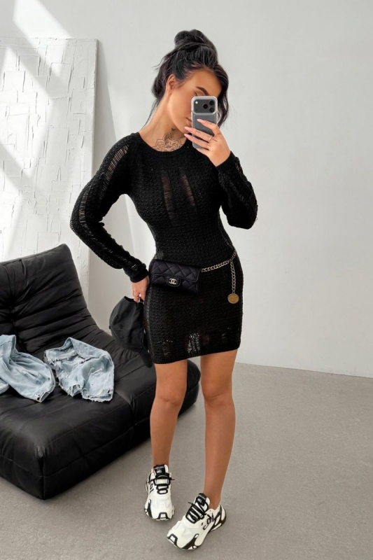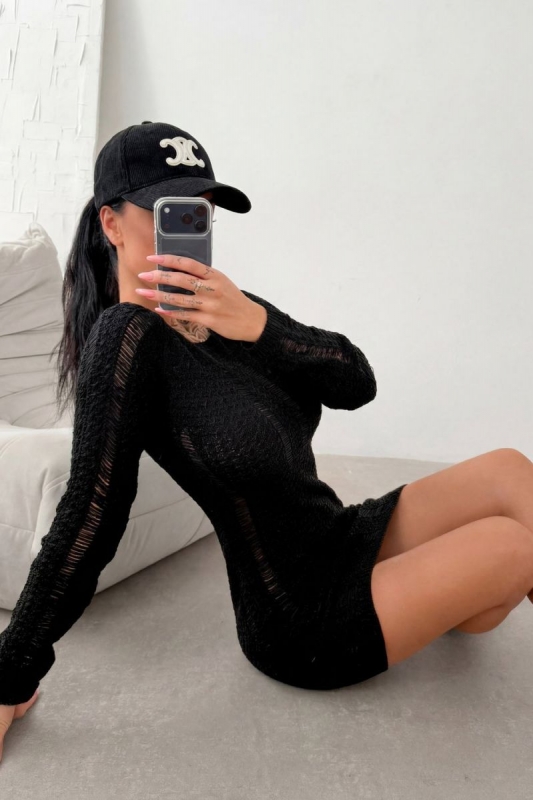 Testhezálló, hosszú ujjú ruha rugalmas, strukturált kötött anyagból. Klasszikus, zárt nyakkivágással készült, az áttört (azsúros) textúra különleges megjelenést biztosít.