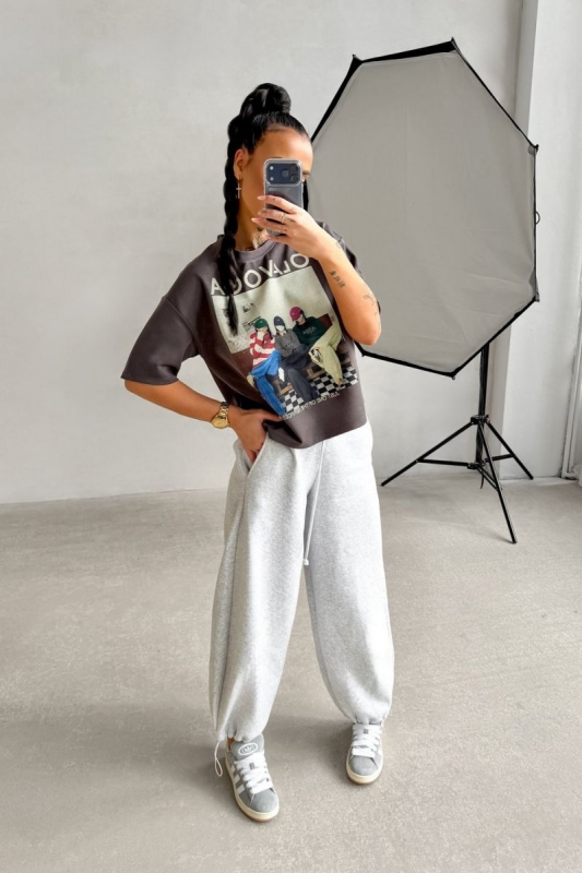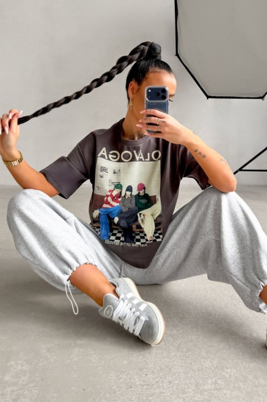 Laza, boxy szabású póló rövid ujjal és kerek nyakkivágással. Elöl grafikus mintával és hangsúlyos logóval díszített.