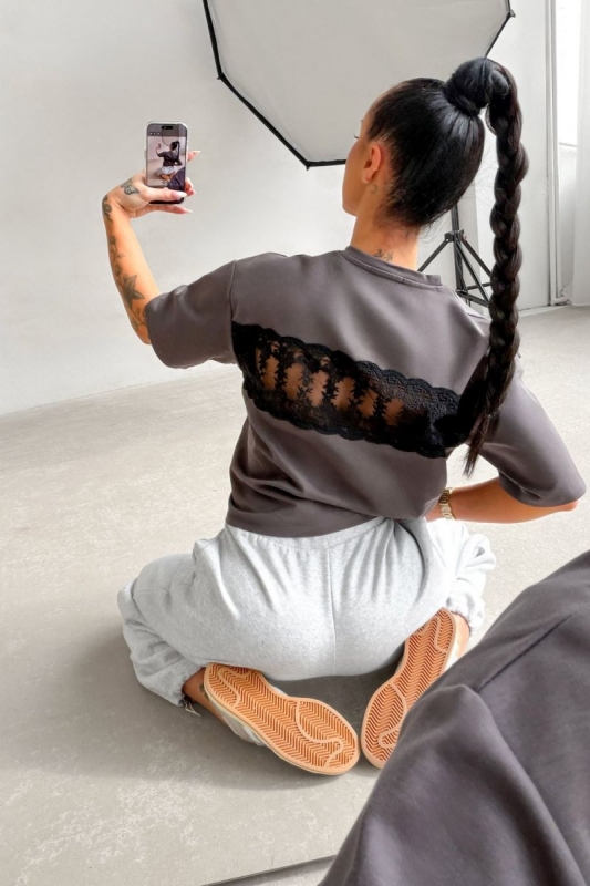 Hátul kontrasztos, áttetsző csipkepanel teszi különlegessé, amely nőies és egyedi megjelenést kölcsönöz.